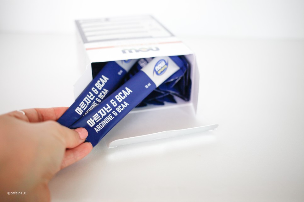 슬림한 스틱포로 늘 가방에 쏙 넣어두었다가 운동 전 한포씩 먹기 좋게 이지컷 되어있다.